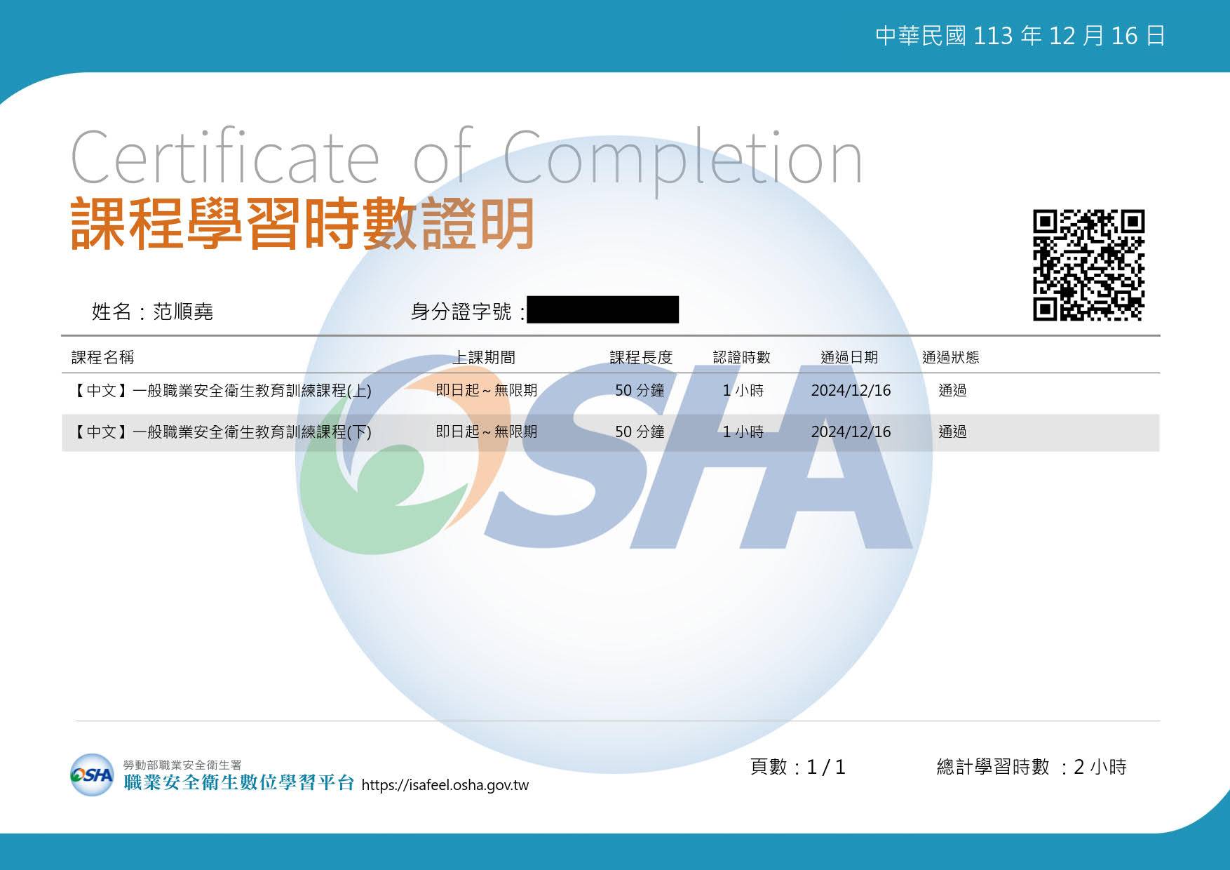 1.一般職業安全衛生教育訓練課程(上) 2.一般職業安全衛生教育訓練課程(下)