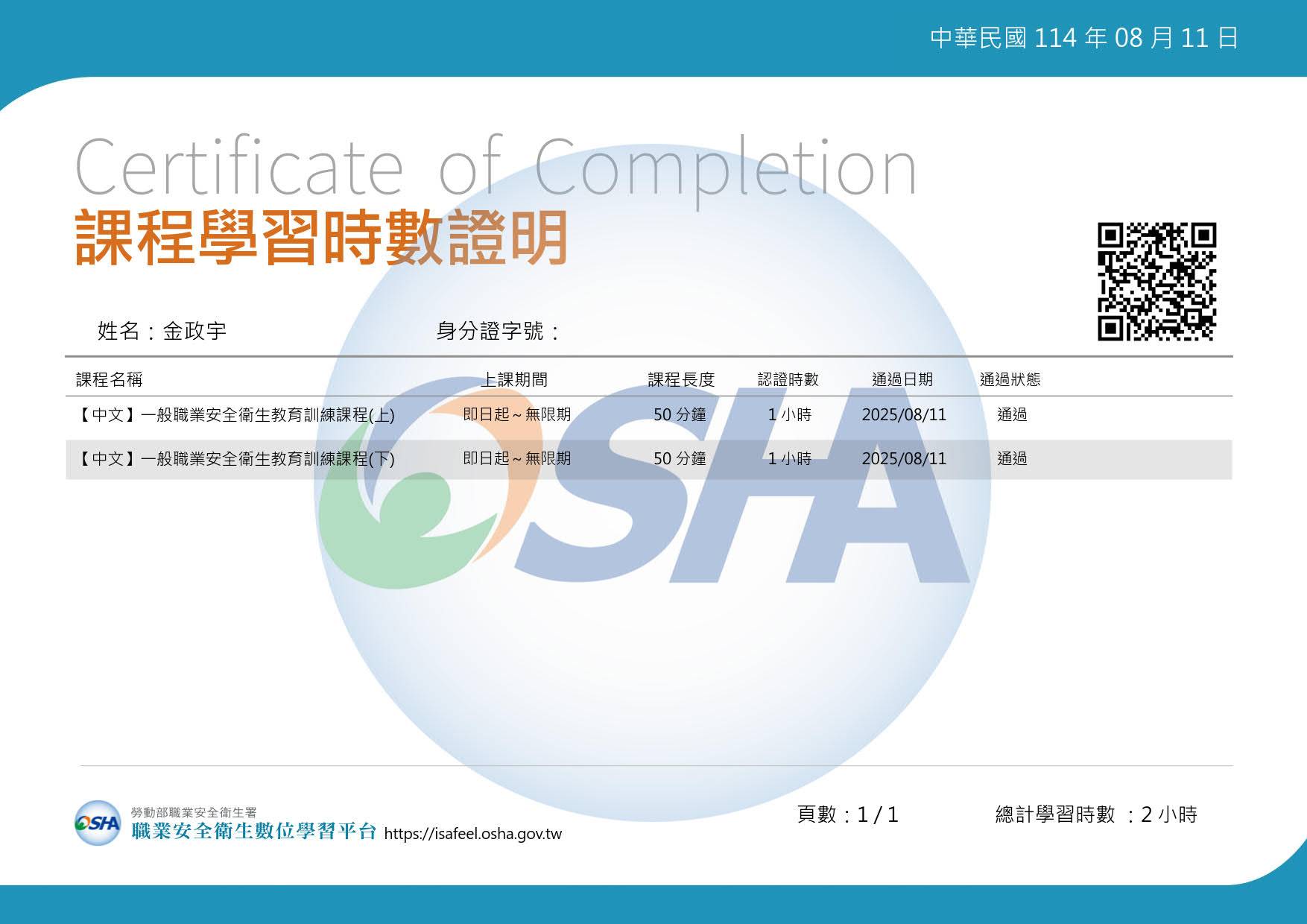 1.一般職業安全衛生教育訓練課程(上) 2.一般職業安全衛生教育訓練課程(下)